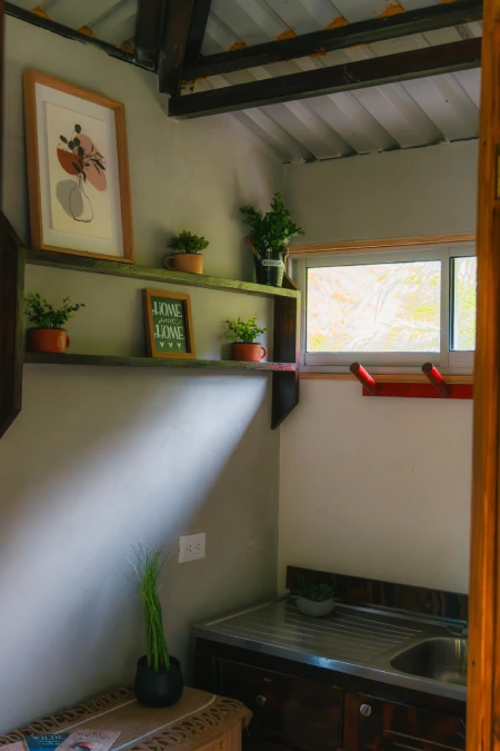 Cada pieza de mobiliario cuenta una historia, elaborada con amor por artesanos locales que se inspiran en el ritmo de la selva que los rodea. Usando madera de origen sostenible y técnicas tradicionales transmitidas a través de generaciones, cada mesa, silla y pieza decorativa refleja tanto la artesanía como un profundo respeto por la naturaleza. Las texturas son orgánicas, los acabados cálidos y el diseño combina sin esfuerzo comodidad con autenticidad. Al hundirte en los asientos mullidos, las suaves telas y materiales naturales te invitan a desacelerar y simplemente ser. La luz del sol se filtra suavemente a través del dosel superior, proyectando patrones moteados que bailan por la habitación, un juego siempre cambiante de sombras y luz que te recuerda que aquí, la naturaleza es la verdadera diseñadora.